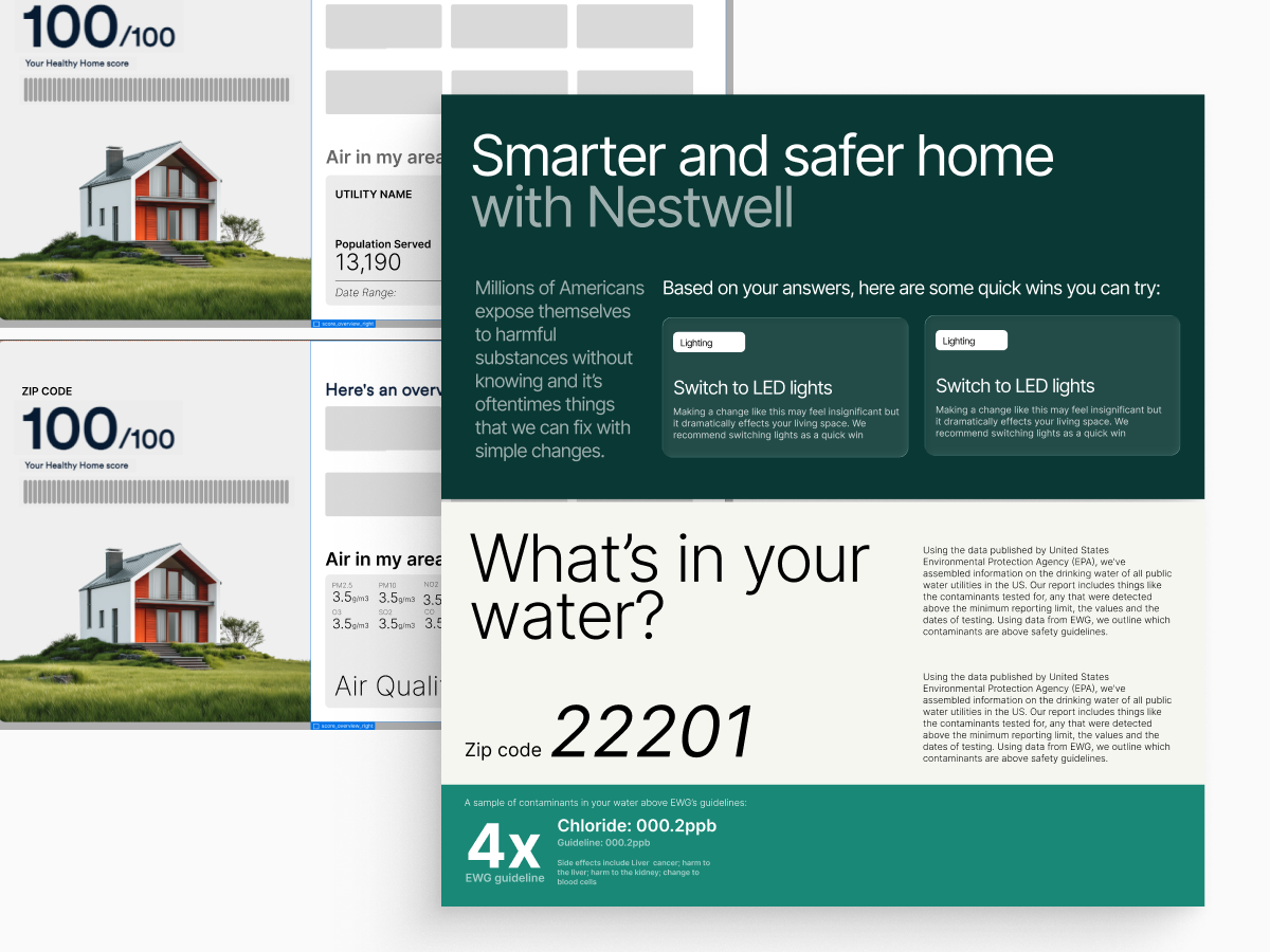 By far one of the most enjoyable projects, we've worked on to date. We started with an idea and quickly got this launched as an MVP in Webflow. This included the design and development of a landing page, multistep form, free and paid report. This project required the integration of Memberstack to track form signups and store user specific information. We compiled open-source data on water + air quality and created a zip code specific tool for assessing your area's water + air quality. This pulled things like number of contaminants, strength of contaminant and severity. We built out a 100+ item CMS system to serve products based on a user's score.