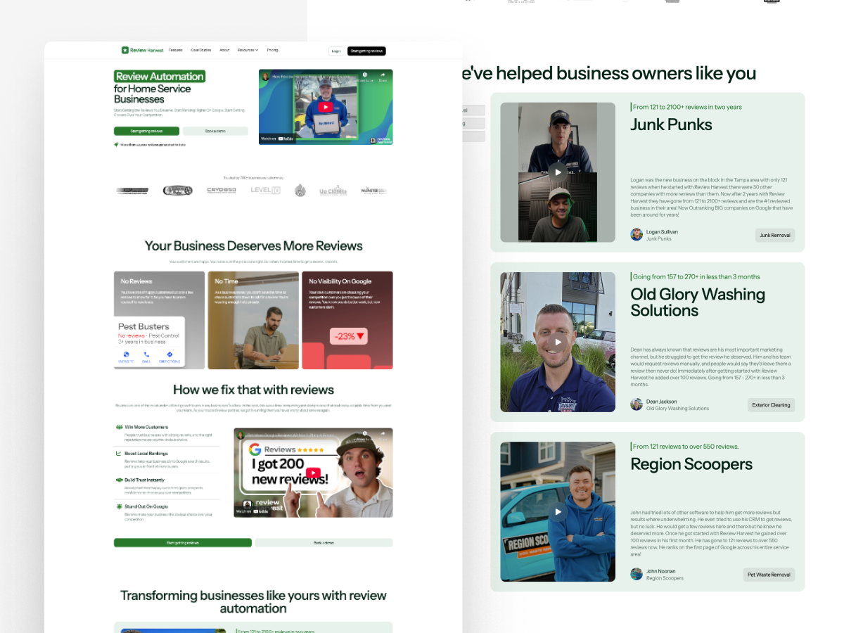 Review Harvest needed help with their website and wanted a brand update. They didn't want to stray far from their existing branding but still wanted to explore options. We worked closely with the Review Harvest team to create a website and branding that ultimately resonated with their target demographic, home service business owners.